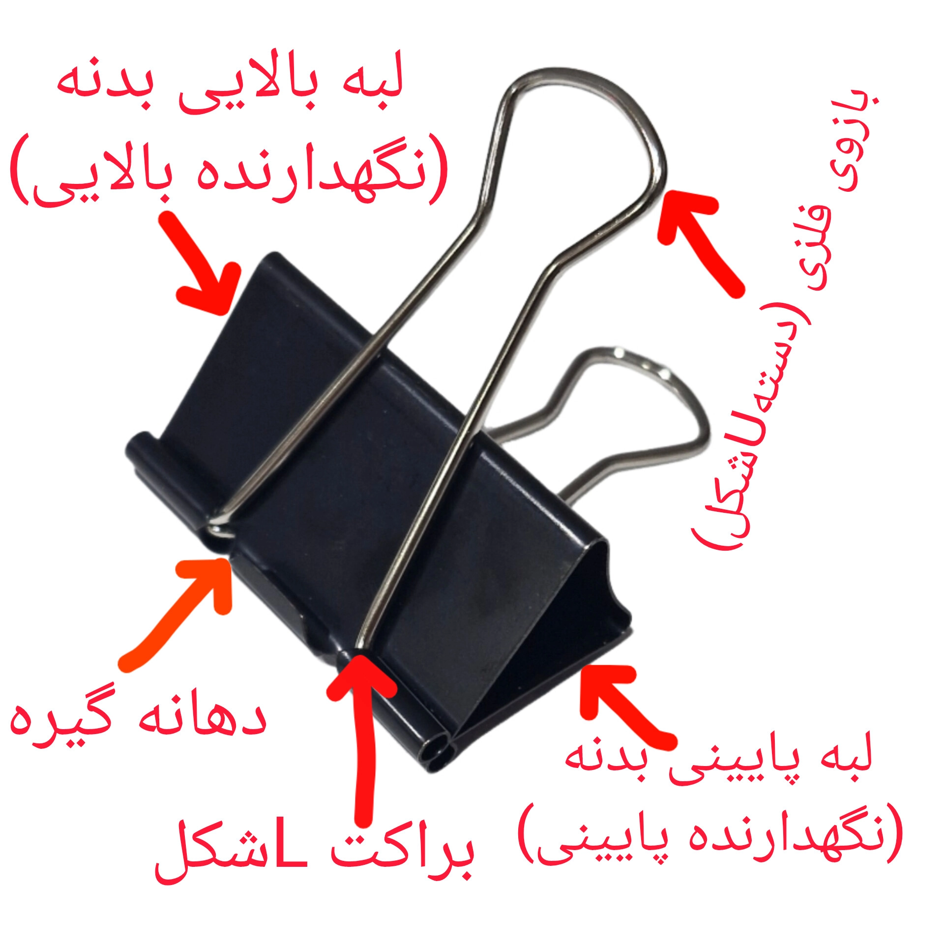 - بازوی فلزی (دسته): بخش U شکل که با فشار دادن، دهانه باز میشود و کاغذها بین آن قرار میگیرند.