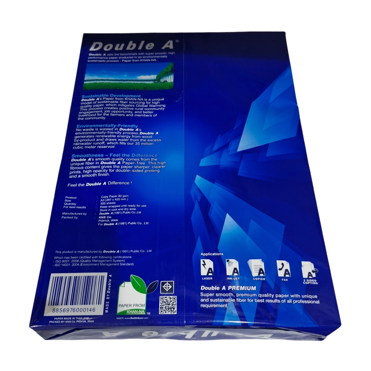 کاغذ دبل آ اصل تایلند است و در ایران بسته‌بندی می‌شود تا کیفیت اولیه حفظ شود و هنگام حمل و نگهداری دچار آسیب نشود. بسته‌بندی استاندارد و مقاوم آن، امکان ذخیره طولانی مدت بدون آسیب دیدن کاغذ را فراهم می‌کند.